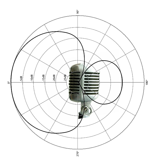 Shure is the leading manufacturer of live stage microphones in the world and the Super 55 Deluxe is a rechassied version of their popular SM58 vocal microphone (as seen on literally every live stage ever) with a retro design and a supercardioid response pattern that when superimposed on the microphone looks something like this: