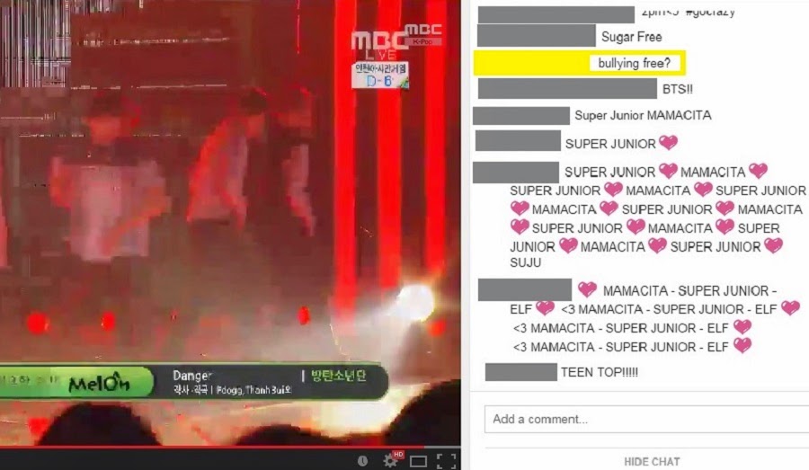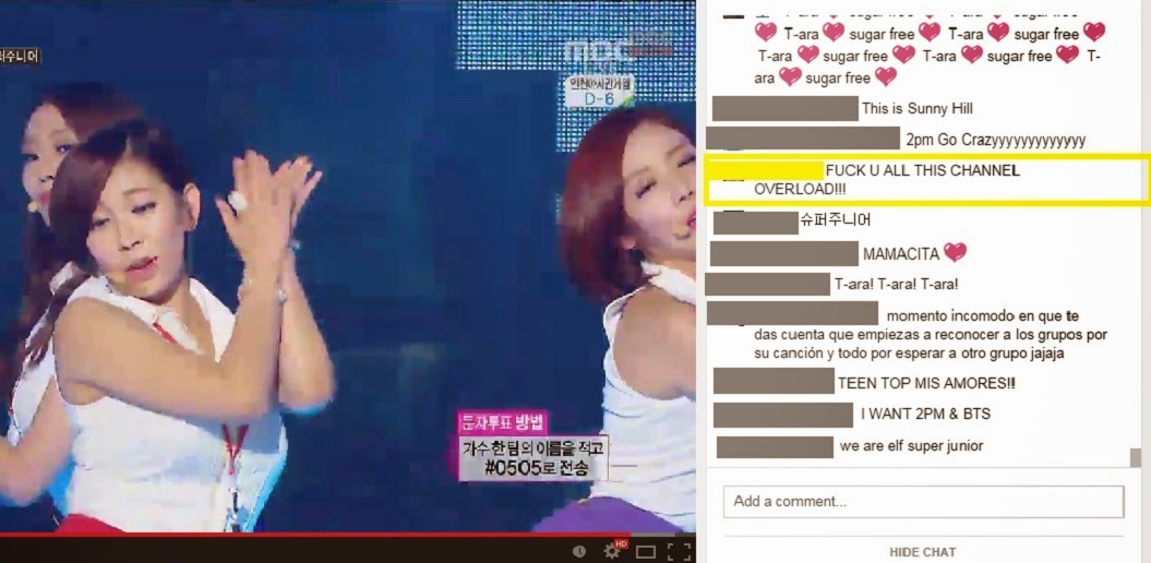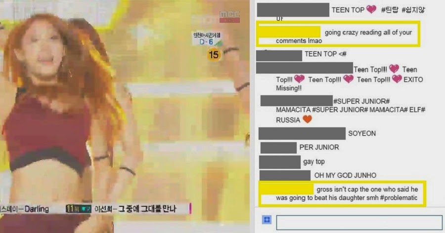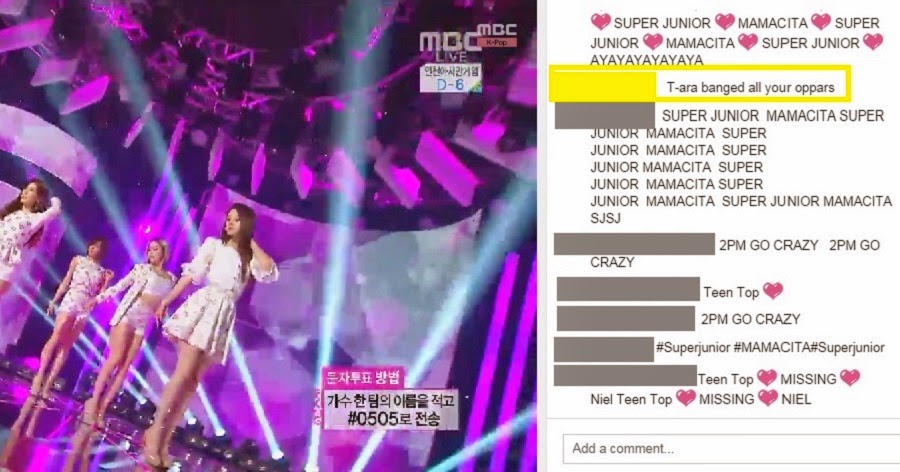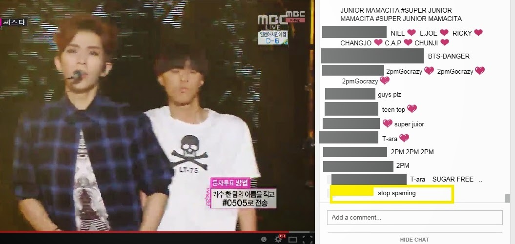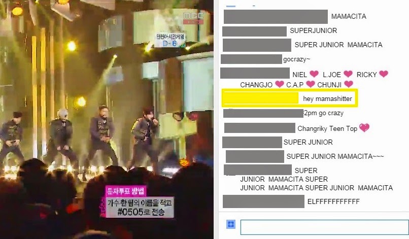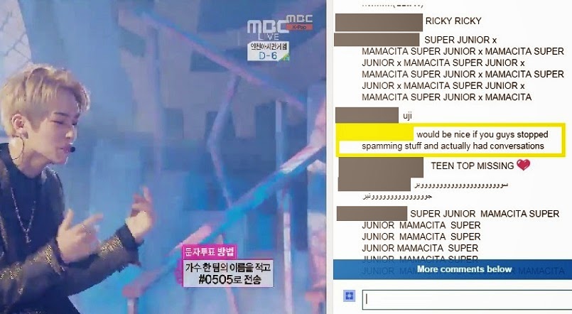 From the beginning, the chat consisted of almost nothing but group spam, primarily for the biggest acts of the evening: Super Junior, 2PM and T-ara. Three songs in, someone already just could not anymore.